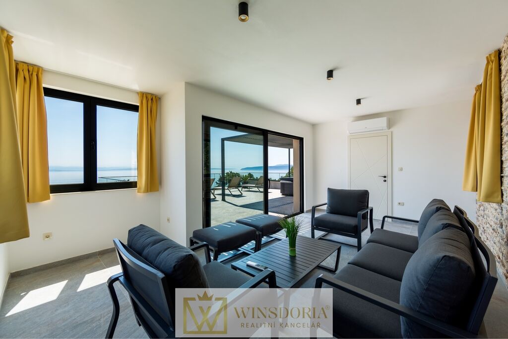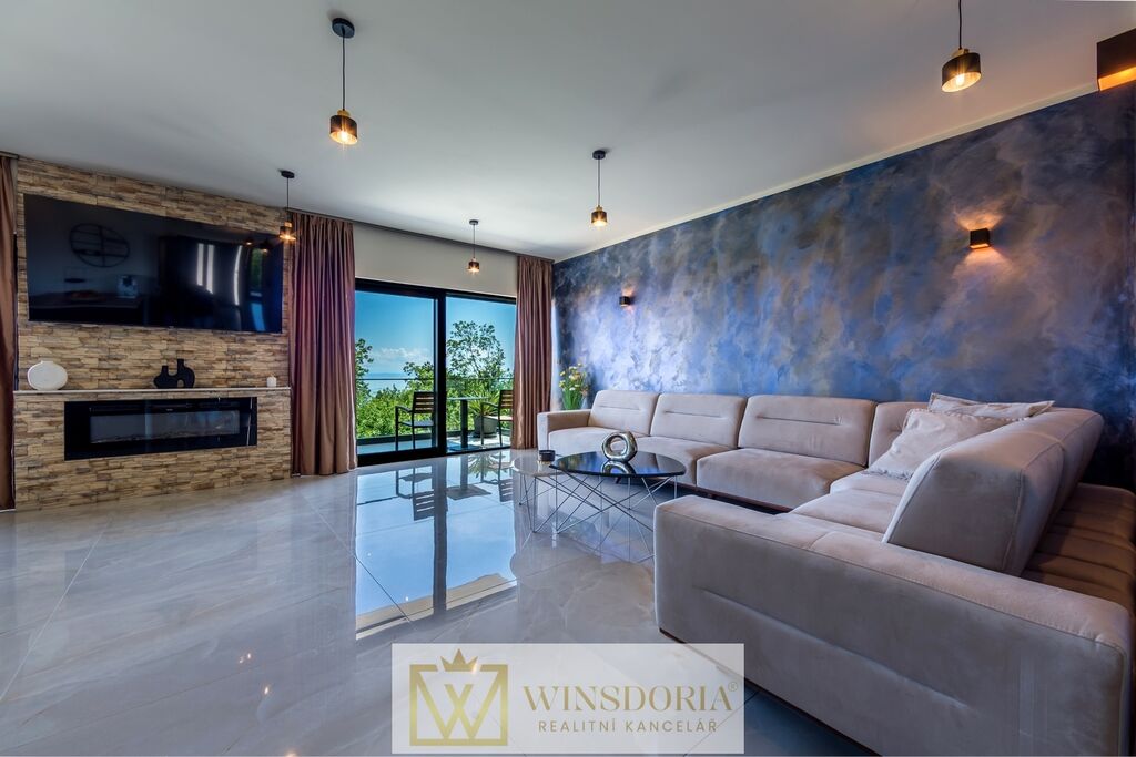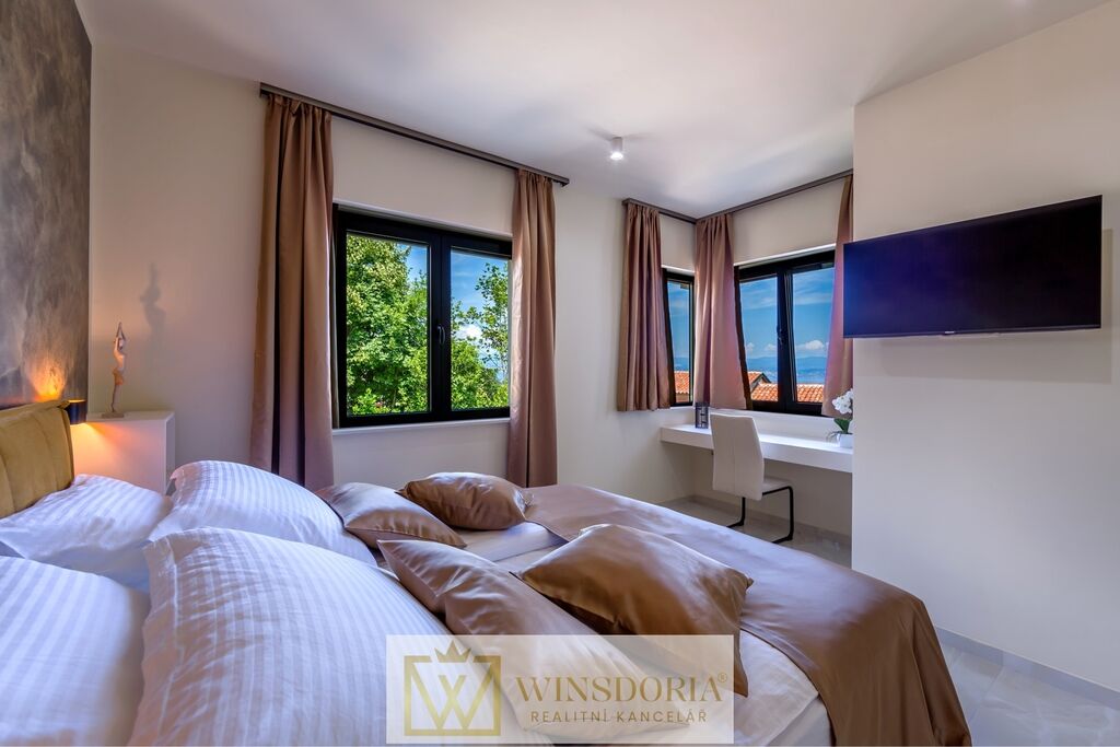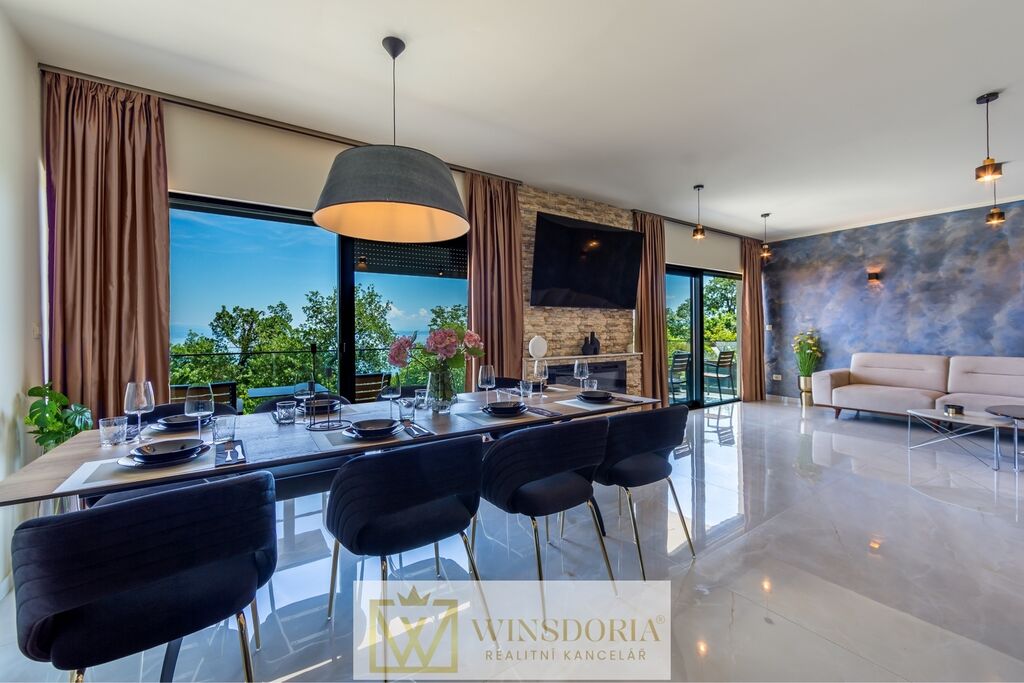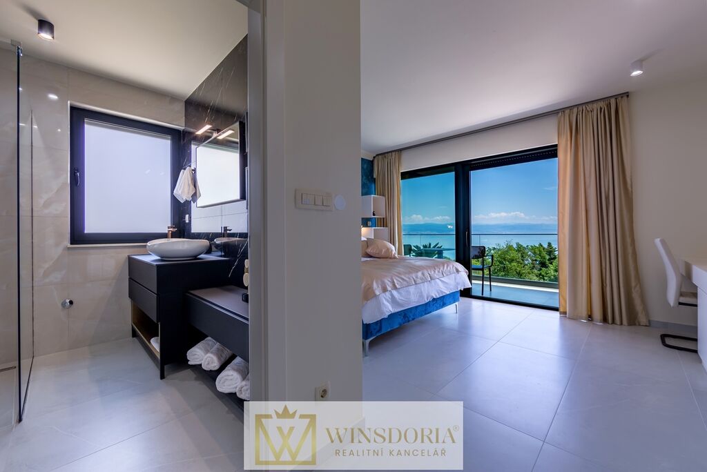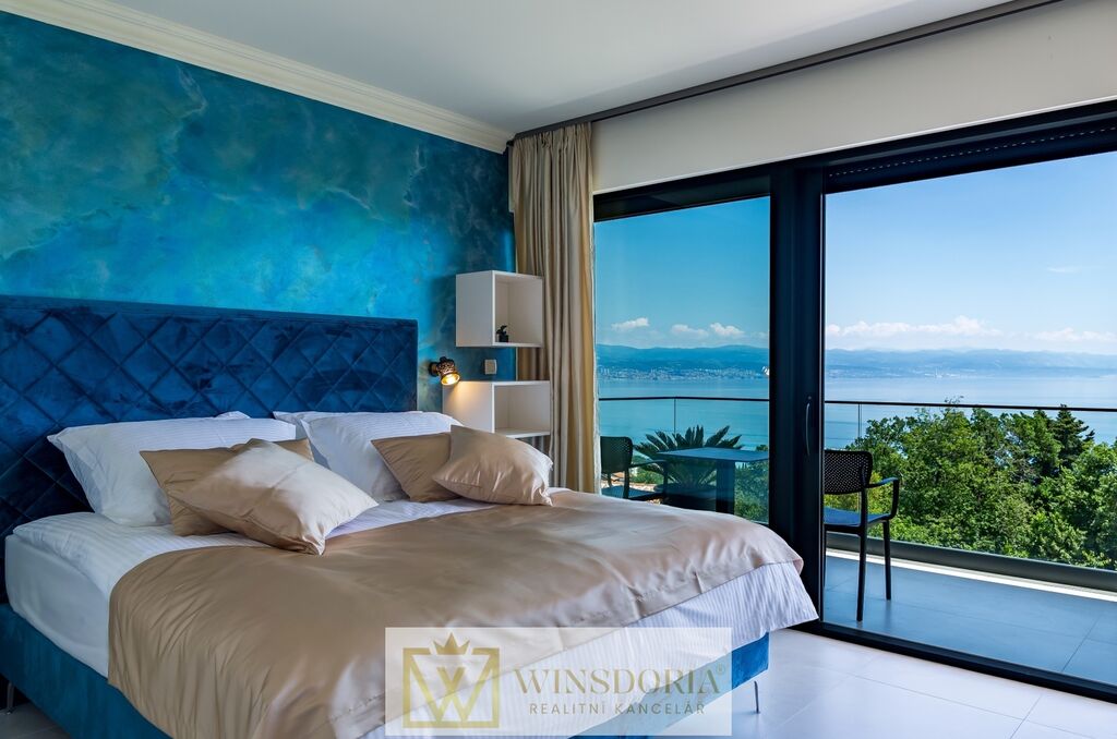 V klidné lokalitě Oprić, nedaleko Lovranu a Opatije, se nabízí k prodeji exkluzivní samostatně stojící vila moderní architektury s vyhřívaným krytým bazénem a panoramatickým výhledem na celý Kvarnerský záliv.
