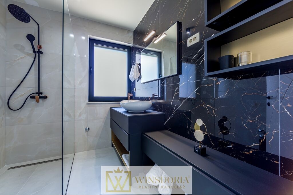 Nemovitost se rozkládá na dvou podlažích a svým promyšleným dispozičním řešením a kvalitním provedením uspokojí i náročné klienty. V přízemí se nachází prostorný obývací pokoj propojený s elegantní kuchyní a jídelnou. Prosklené stěny zajišťují dostatek denního světla a přímý vstup na terasu s výhledem na moře.