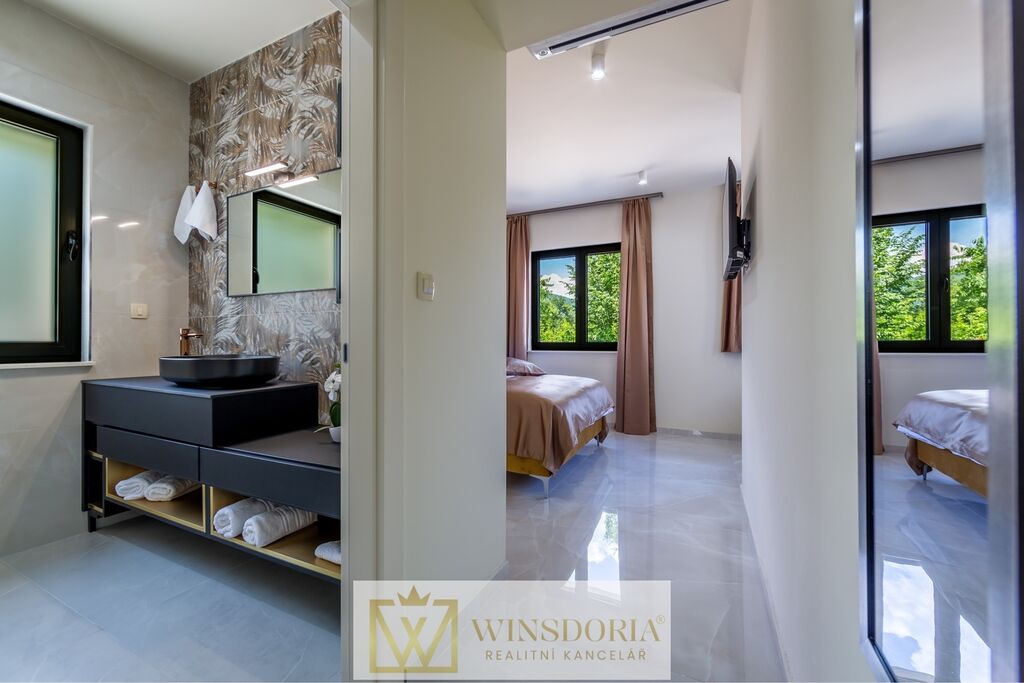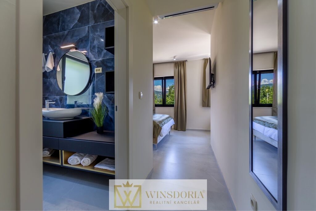 Vnitřní schodiště vede do prvního patra, kde se nacházejí čtyři komfortní ložnice, každá s vlastní moderní koupelnou, které poskytují maximální soukromí a pohodlí. Z pokojů je přístup na balkon s krásným výhledem na moře a okolní zeleň.