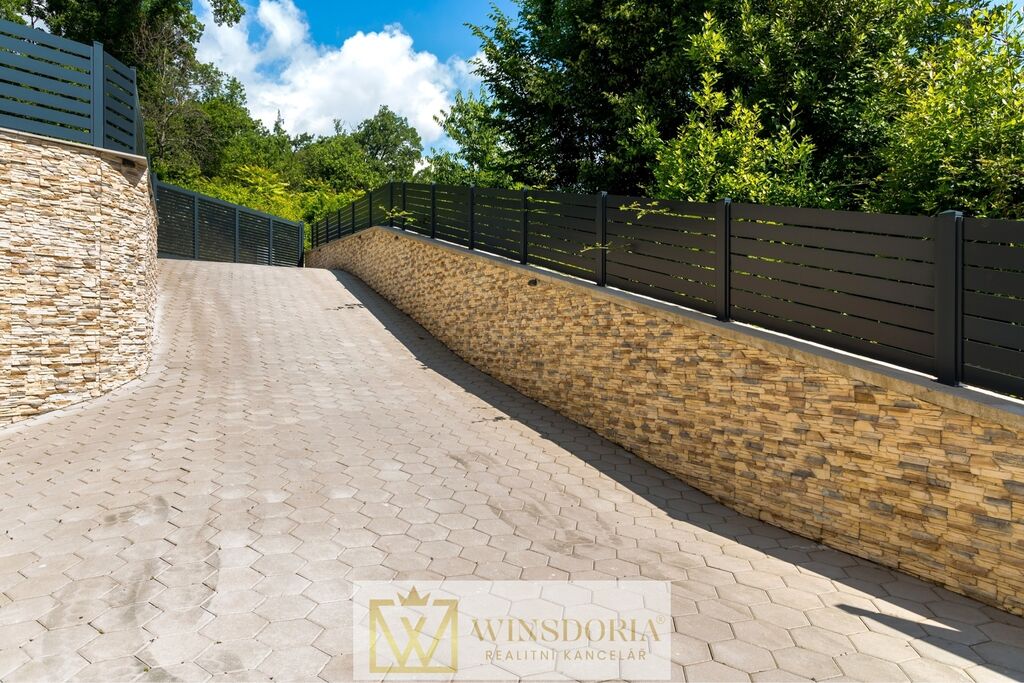 Dům je plně klimatizovaný, vybavený kvalitními hliníkovými okny s elektrickými roletami a tepelněizolační fasádou. K dispozici je garáž s přímým vstupem do interiéru a další parkovací místa na pozemku.