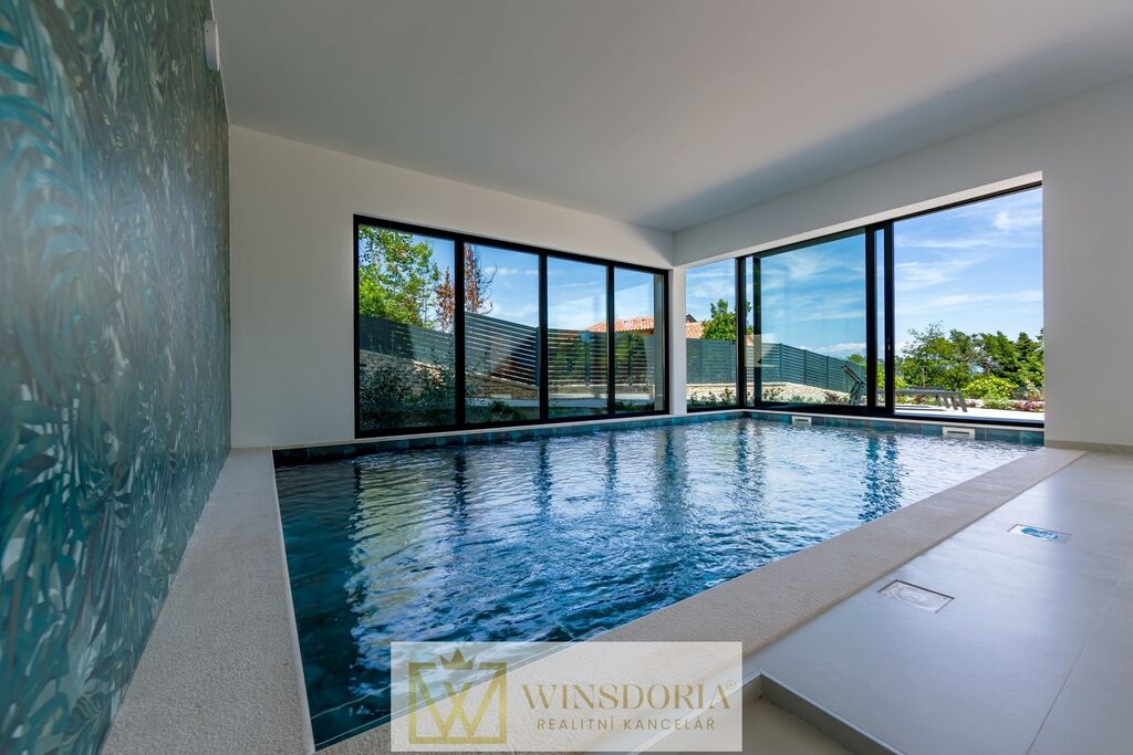 V přízemí vily se nachází vyhřívaný krytý bazén s vířivkou a přímým vstupem na upravenou oplocenou zahradu. Součástí venkovního prostoru je letní kuchyně s velkým jídelním stolem a grilem, ideální pro společenská setkání.