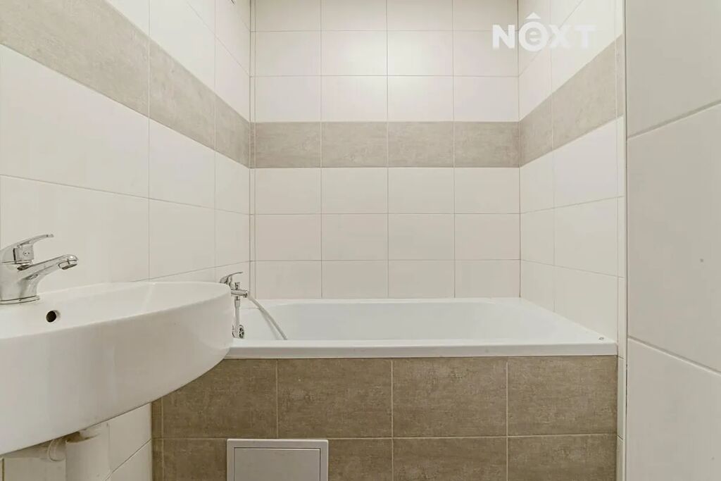 Koupelna: Moderní koupelna s novými obklady, vanou a novou sanitární technikou.
