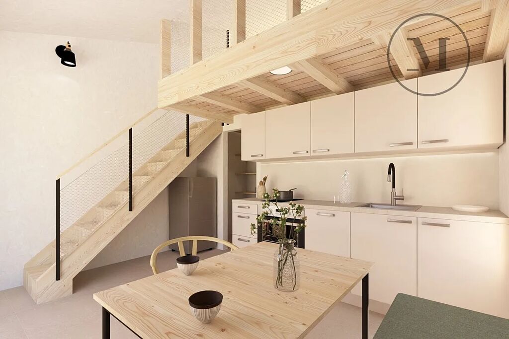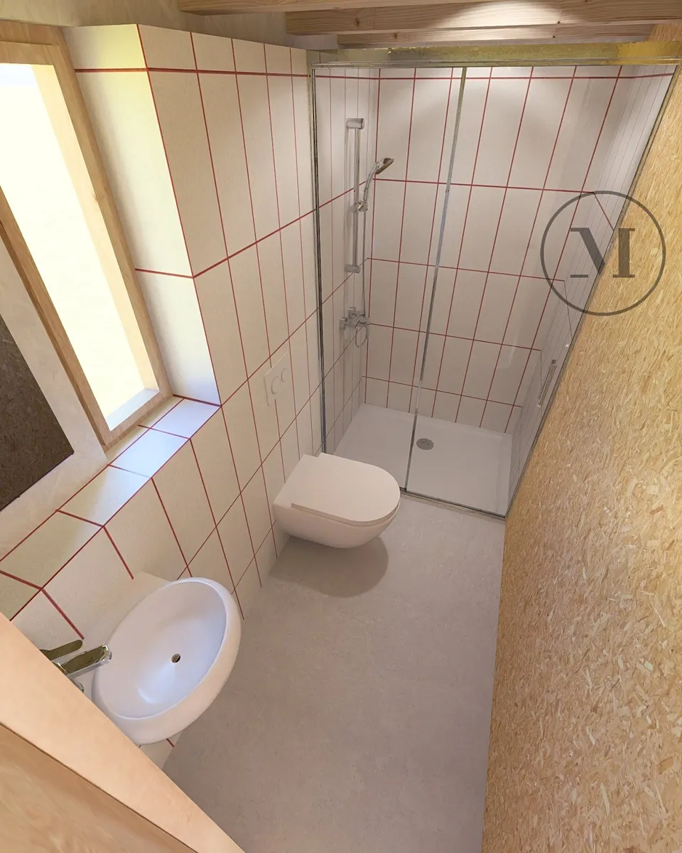 Interiér nabízí: prostor pro kuchyňku, stolek a sezení, sprchu, WC a umyvadlo, úložné prostory a chladicí zónu (např. lednice/mrazák pro ovoce a zeleninu), schody na půdu, kde je prostor třeba na sušení bylin či ovoce nebo také prostor pro relaxaci nebo rodinné hry. Součástí standardního vybavení je také koupelna se sprchovým koutem, závěsným WC, umyvadlem a elektrickým ohřívačem vody.