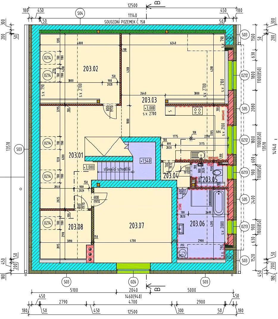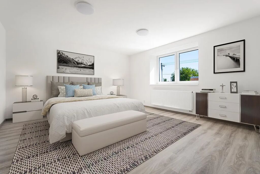 Na vstupní halu (23,4 m2) z levé strany navazuje šatna (8,7 m2) sousedící s ložnicí (21,3 m2), která je orientovaná na východ. Dětský pokoj (20,2 m2) je orientovaný na jih.