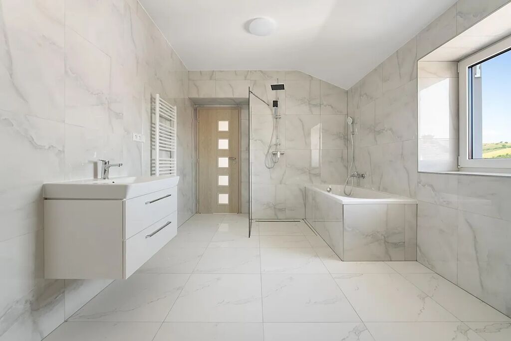 Hlavní denní místnost bytu obývací pokoj spolu s kuchyňským koutem nabízí velkorysých 43,6 m2. Za kuchyňským koutem se nachází samostatná toaleta se závěsným klozetem a prostorná koupelna (12,2 m2), která disponuje sprchovým koutem i vanou. K bytu náleží vlastní garáž / dílna (44 m2), parkovací místo a další sklepní prostory (15 m2), které je možné využít mimo jiné jako dílnu.