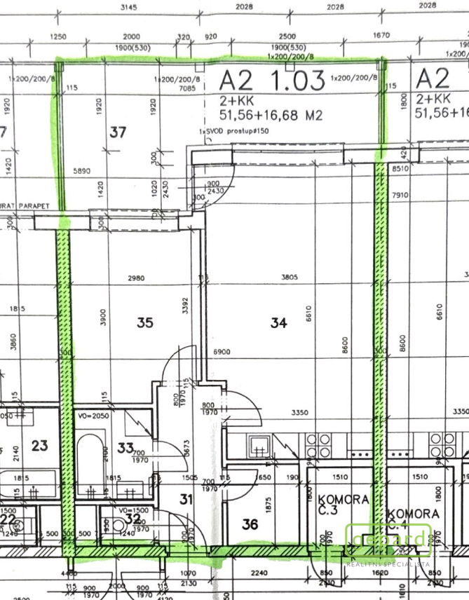 Celková výměra činí 70,94 m² (byt 51,56 m² + terasa 16,67 m² + komora 2,7 m²). Komora je v bezprostřední blízkosti, vedle vchodu do bytu.