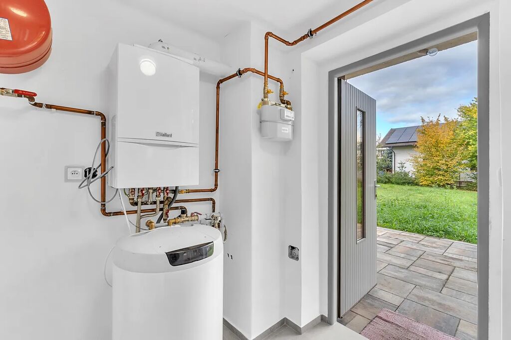 Dům má kompletně nové rozvody elektřiny, vody a topení. Vytápění zajišťuje plynový kotel Vaillant a zásobník teplé vody. Kvalitní izolace a nová okna přispívají k nízkým provozním nákladům. Bezpečnostní oplocení a dálkově ovládaná brána zajišťují soukromí. Před garáží je zpevněná plocha pro parkování několika vozidel.