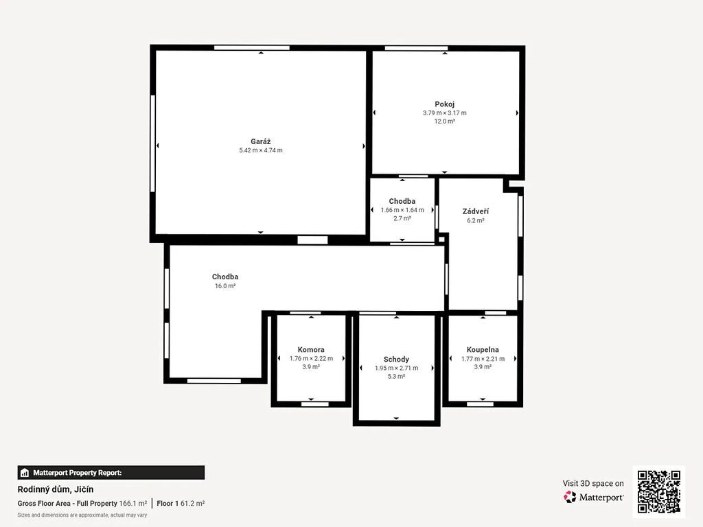 V přízemí se nachází garáž s dálkovým ovládáním a přímým vstupem do domu, komora, prostorná vstupní chodba, koupelna s vanou a přímý vstup na zahradu. Ze zádveří vede schodiště do sklepa i do horního patra.