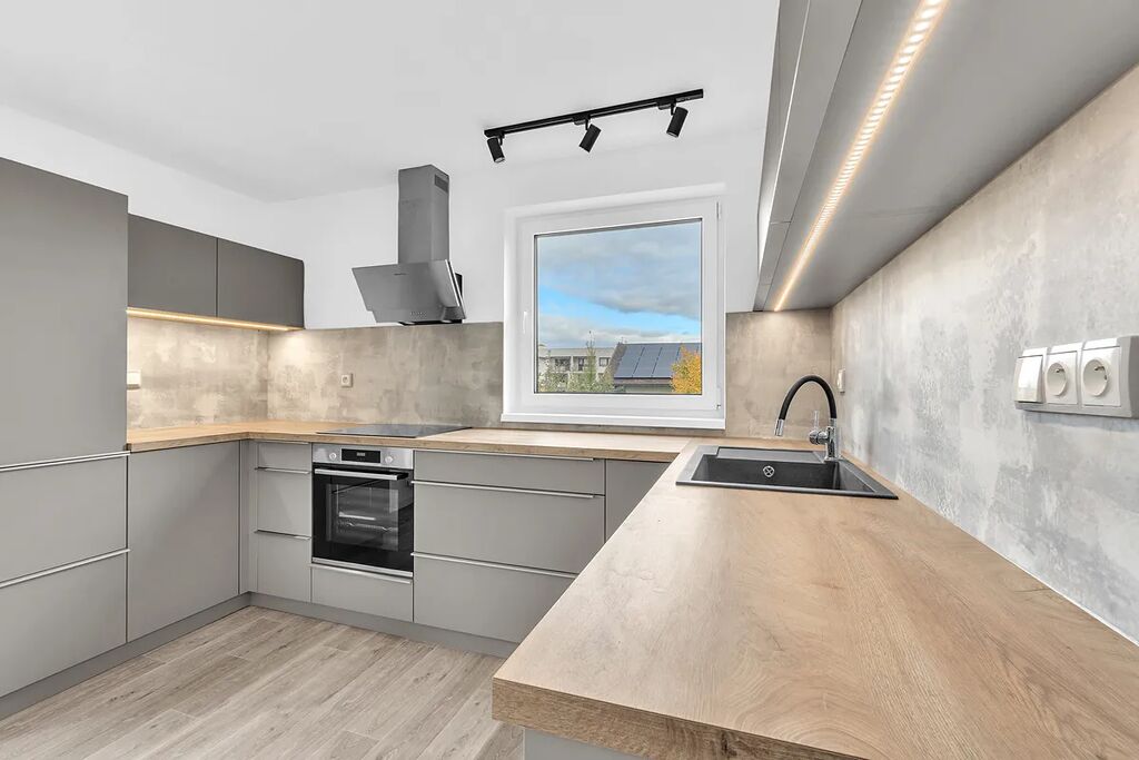 Horní patro nabízí prostorný obývací pokoj s přímým vstupem na terasu, novou kuchyňskou linku s vestavěnými spotřebiči (elektrická trouba, myčka, sklokeramická varná deska), ložnici a další obytné místnosti. Druhá koupelna je vybavena sprchovým koutem.