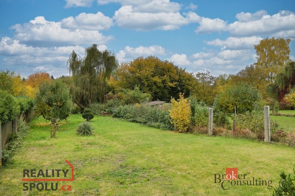 Pozemek má obdélníkový tvar a celkovou rozlohu 641 m2. Je zasazen mezi sousední zahrady a obecní zeleň, takže skýtá dostatek soukromí. V horní části zahrady je několik drobných staveb: garáž + dílna a kolna se třemi segmenty. Zahrada (trávník, stromy, oplocení) je udržovaná. K zalévání zahrady lze využít vodu ze studny, která je na hraně pozemku a je sdílená se sousedním domem.