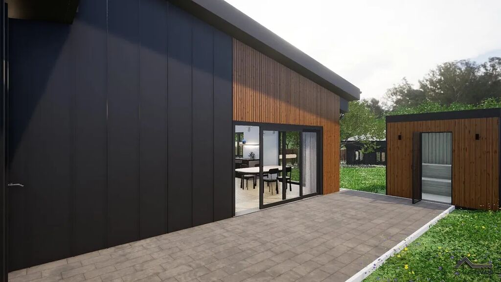 Konstrukce domu je zateplena moderní PUR/PIR izolací s vynikajícími tepelně-izolačními vlastnostmi. Fasáda kombinuje plech a dřevěné obložení na provětrávaném roštu – elegantní a trvanlivé řešení.