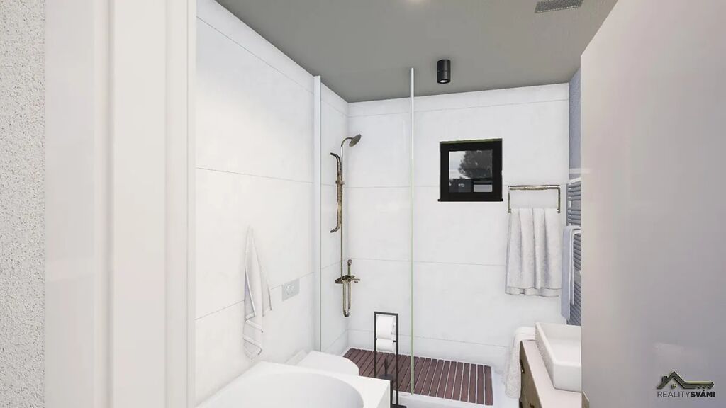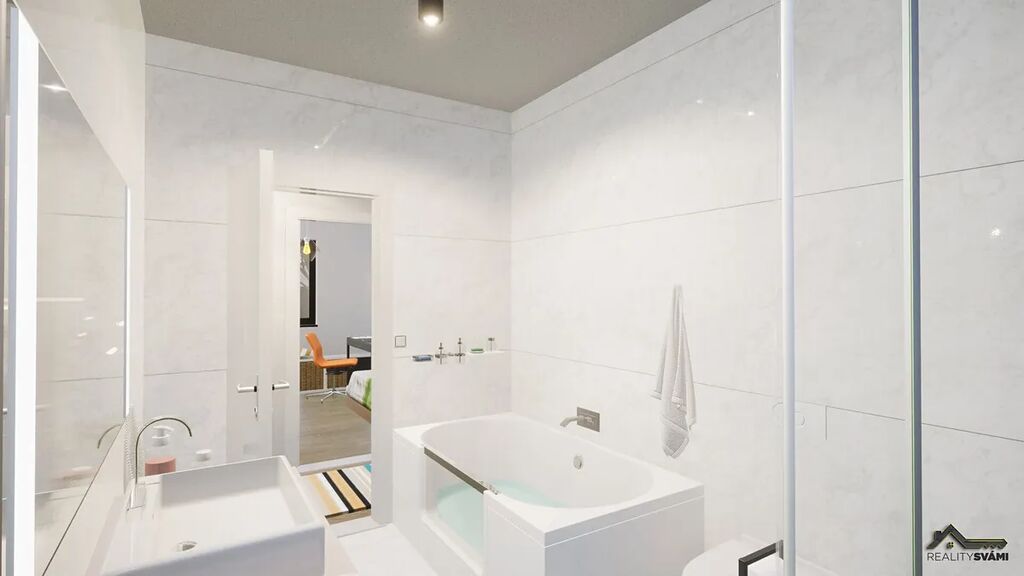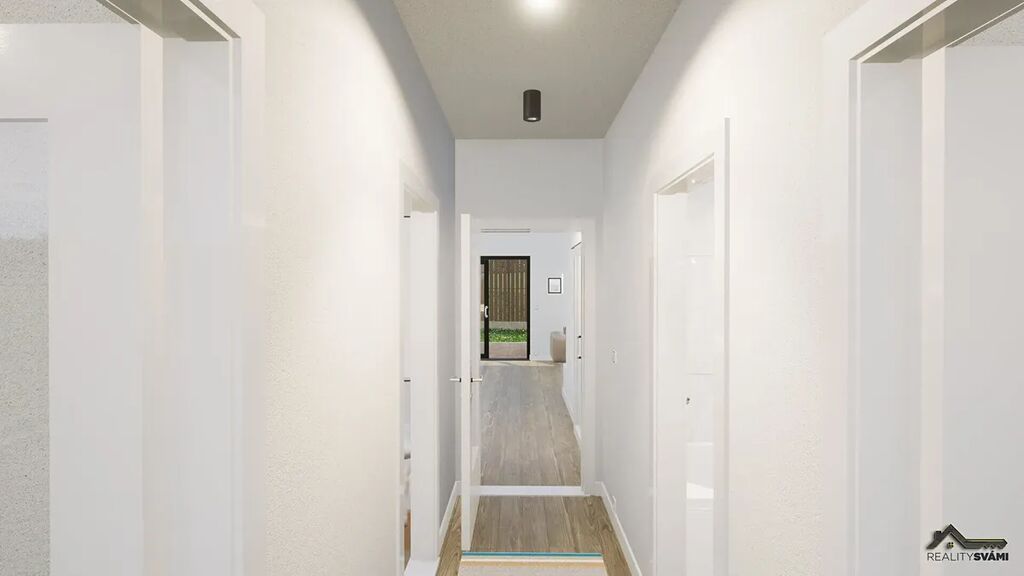 Interiér je navržen s důrazem na funkčnost a komfort moderního bydlení. Prostorný obývací pokoj s kuchyňským koutem plynule navazuje na soukromou zahradu, která nabízí klid a dostatek soukromí.