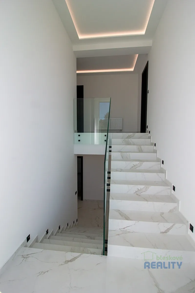 V patře jsou dvě velké ložnice s vlastní koupelnou (značkové vybavení Grohe), třetí pokoj vhodný jako pracovna či herna, společná koupelna, úklidová komora a otevřená galerie s velkými okny do zahrady – ideální pro odpočinek nebo klidnou práci.