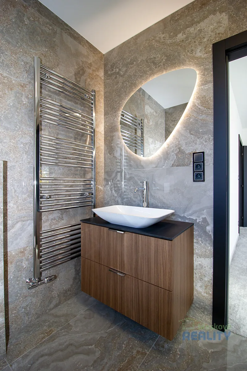 Topení je kombinované – podlahové a radiátory, připravena je i instalace pro tepelné čerpadlo a klimatizaci. Samozřejmostí jsou elektrické předokenní rolety a nabíječka pro elektromobil.