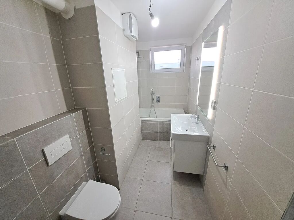 Koupelna s oknem (vana se zástěnou vč. sprchové hlavice, umyvadlo se skříňkou, připojení na pračku, zrcadlo, topný žebřík, závěsné WC, vlastní plynový kotel, větrák).