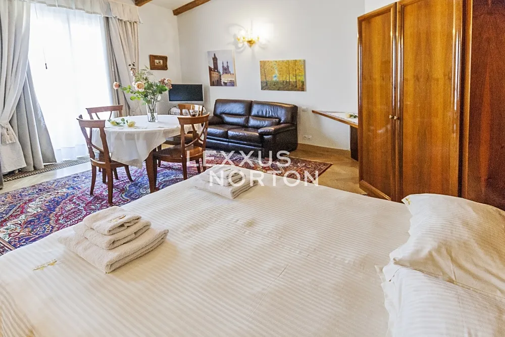Byt je plně zařízený a skládá se z obývacího pokoje, kuchyňského koutu a koupelny. Obývací pokoj je světlý a útulný, vybavený postelí, pohovkou, křeslem, jídelním stolem a dřevěnou skříní. Kuchyňský kout je kompletně vybavený kuchyňskou linkou, varnou deskou, troubou, digestoří a dřezem. Koupelna je prostorná a světlá, disponuje vanou, toaletou, bidetem, pračkou a sušičkou.