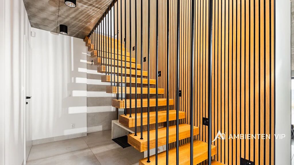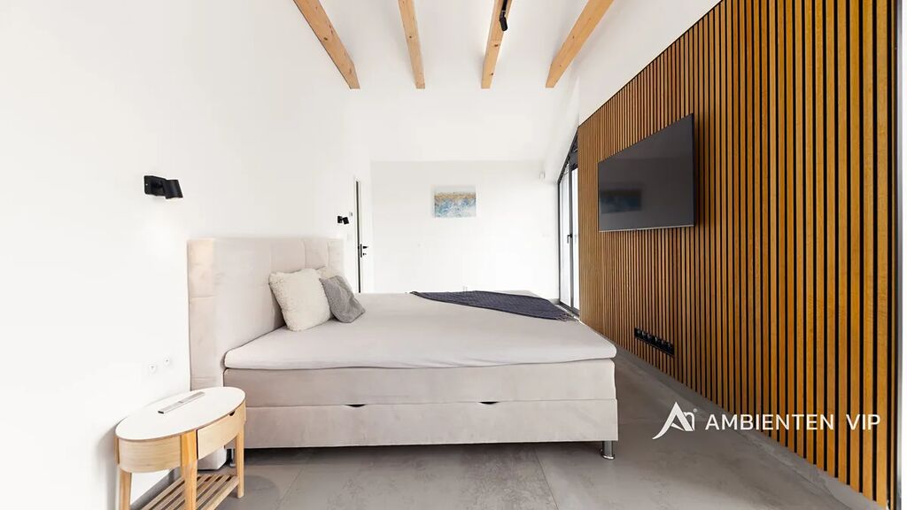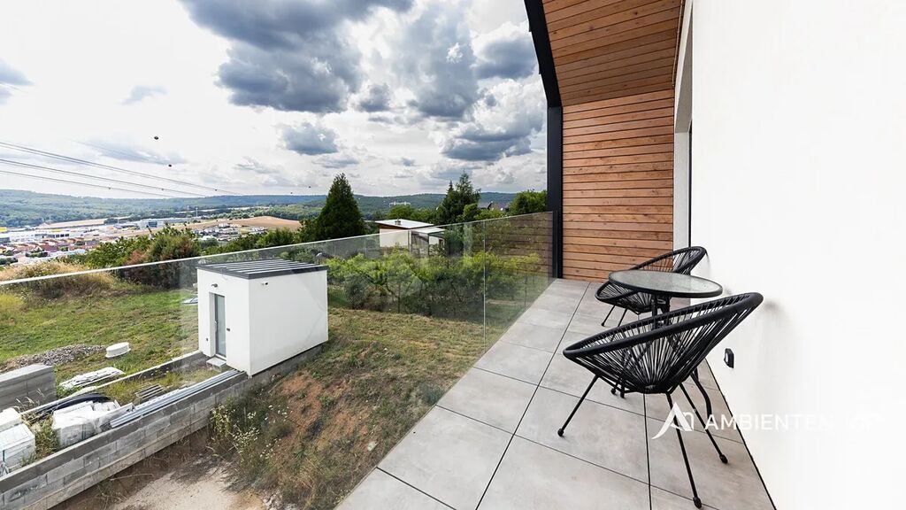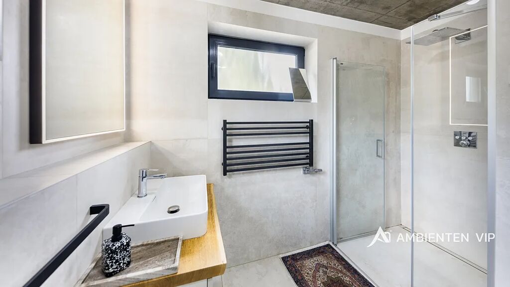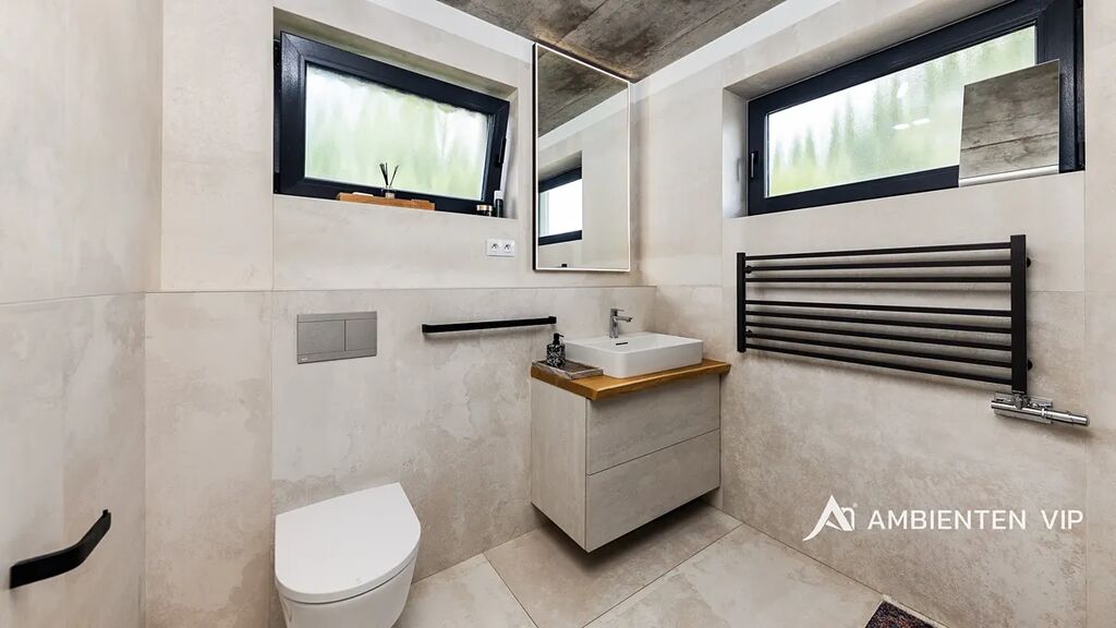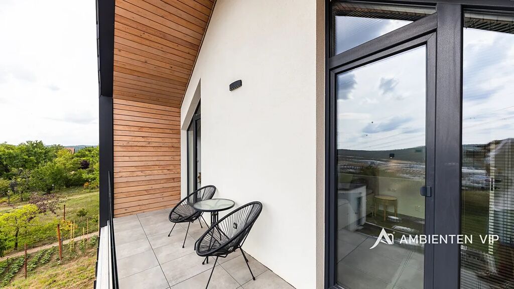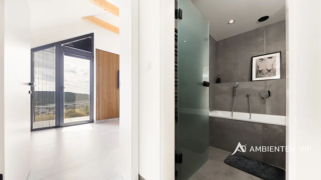 V prvním patře se nachází 3 samostatné pokoje, koupelna s vanou a oddělená toaleta. Hlavní ložnice disponuje vlastní šatnou a má přímý vstup na prostorný balkon, který nabízí jedinečné panoramatické výhledy. V domě se nachází půda, která aktuálně slouží k uložení věcí. Zařizovací předměty jsou od firmy Duravit, baterie od firmy Grohe, umyvadla a toalety od firmy Laufen, zrcadla a doplňky od firmy Nymco. V celém domě je designové osvětlení, zásuvky a vypínače Schneider, WI-Fi vypínače v horním patře domu. Vytápění domu je řešeno přes teplené čerpadlo De Ditrich – podlahové topení s termostaty, dále krb Thor Kratki – pohledový ze tří stran.