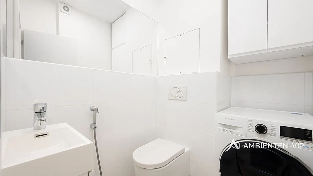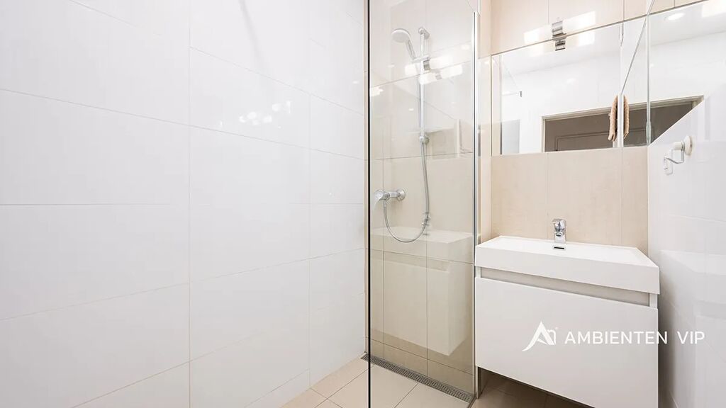 Koupelna je vybavena moderní walk-in sprchou a umyvadlem se zrcadlem. WC slouží zároveň i jako prádelna, kde je umístěna pračka, samostatné umyvadlo a zrcadlo, což zajišťuje praktické řešení prostoru.