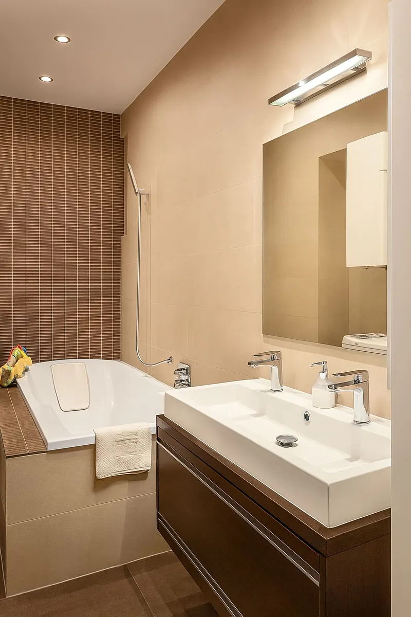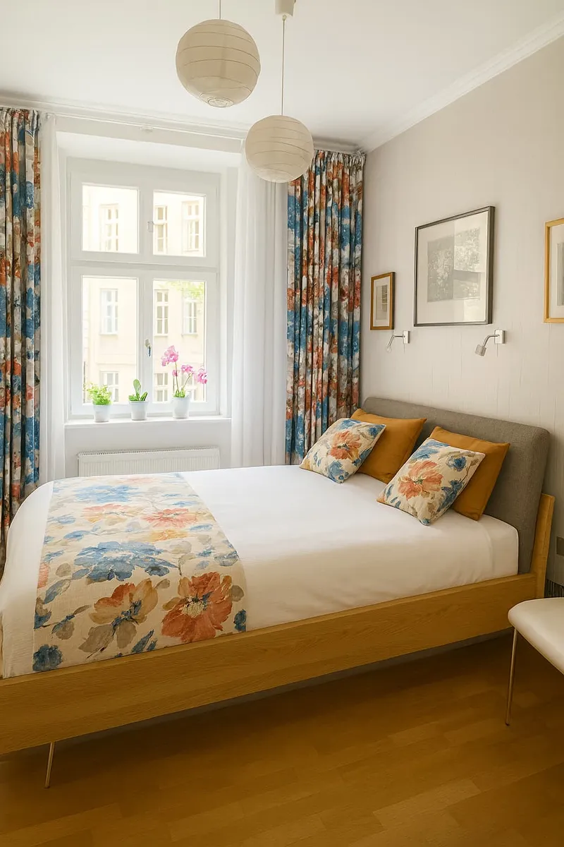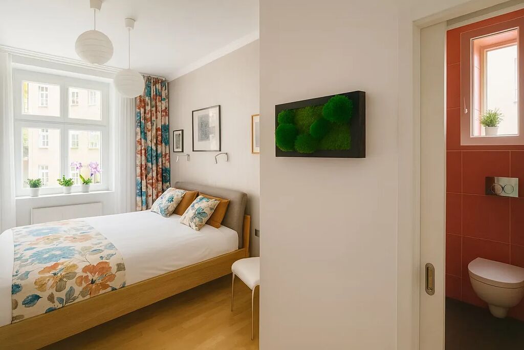 Velká okna orientovaná na sever a jih, vysoké stropy, dřevěné dubové parkety a podlahové topení v koupelnách a kuchyni vytvářejí velmi příjemnou a vzdušnou atmosféru. V bytě jsou vestavěné skříně v každé ložnici i v chodbě. Součástí vybavení je myčka, pračka, trouba, mikrovlnná trouba.
