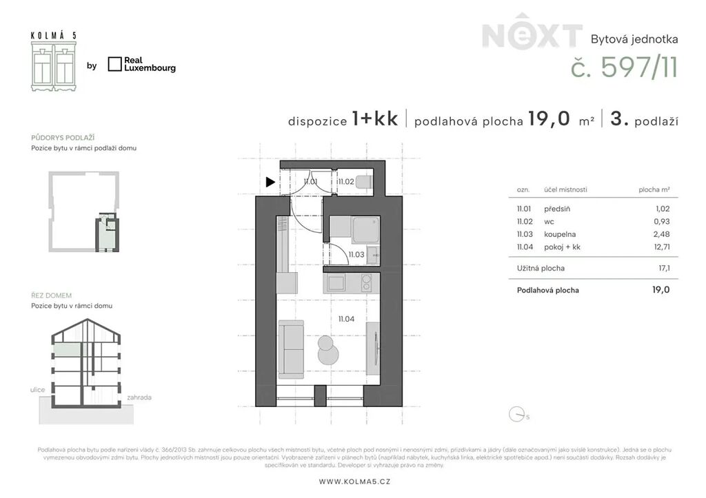 Tato konkrétní jednotka č.11 o dispozici 1kk a podlahové ploše 19 m2 se nachází v 3 nadzemním podlaží s výhledem do ulice. Je členěna na vstupní chodbu, oddělenou koupelnu a toaletu a obývací pokoj s kuchyňským koutem. Přesné rozložení si můžete prohlédnout na přiloženém půdorysu. Vytápění je řešeno elektrickými přímotopy a ohřev vody elektrickým bojlerem.