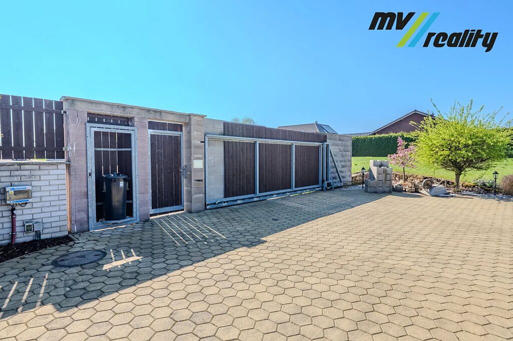 U domu je garáž pro 2-3 vozidla (60 m2), která je propojena s domem zastřešením.