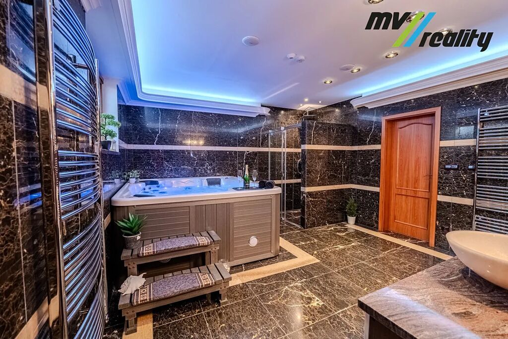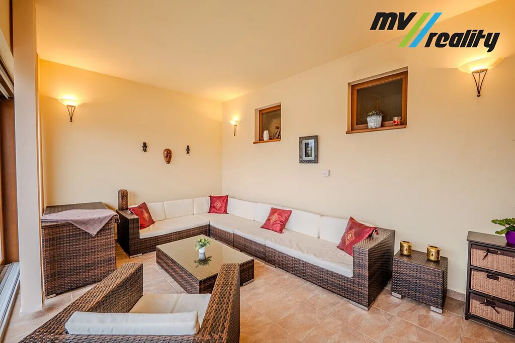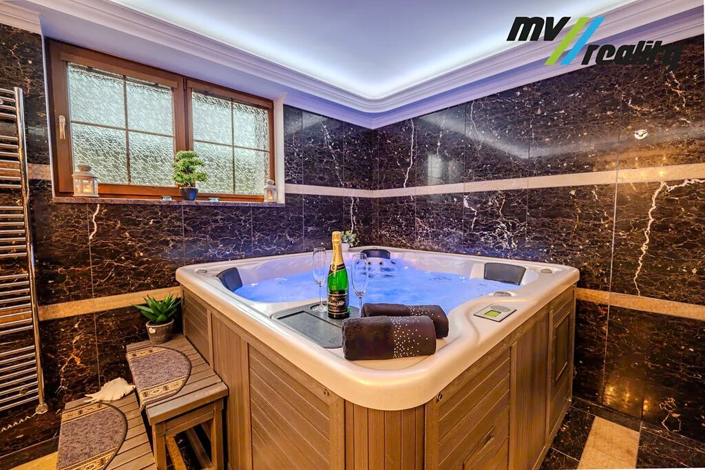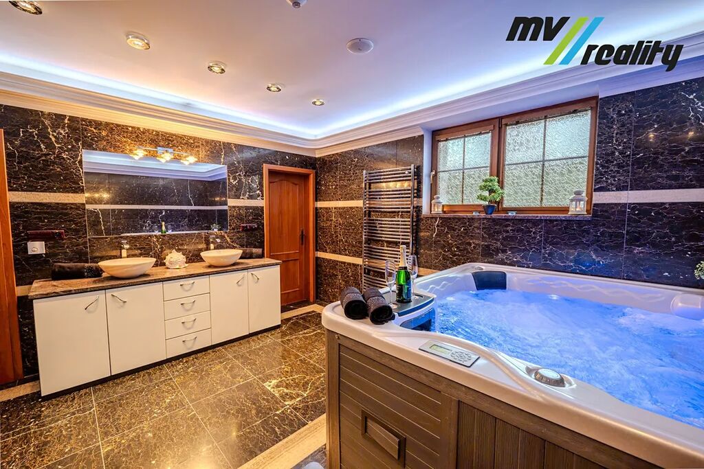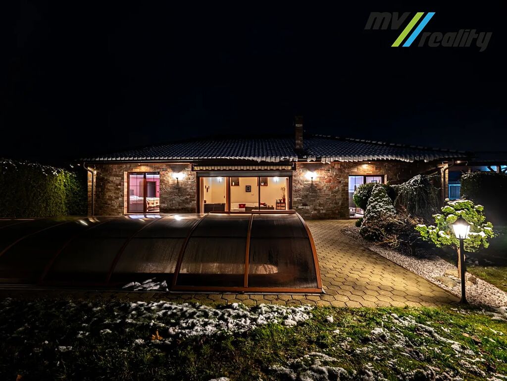 Vstupní chodbou se dostaneme na toaletu, do prádelny a zároveň projdeme do prostorného obývacího pokoje a jídelny s kuchyní. Vedle obývacího pokoje je zimní zahrada, kterou v létě lze otevřít a je z toho příjemné posezení u bazénu. Jídelnou projdeme do klidové zóny, kde jsou 2 pokoje, technická místnost, toaleta, ložnice, 2 šatny a opravdu velká koupelna, kde nalezneme sprchový kout a moderní vířivku pro 6 osob.