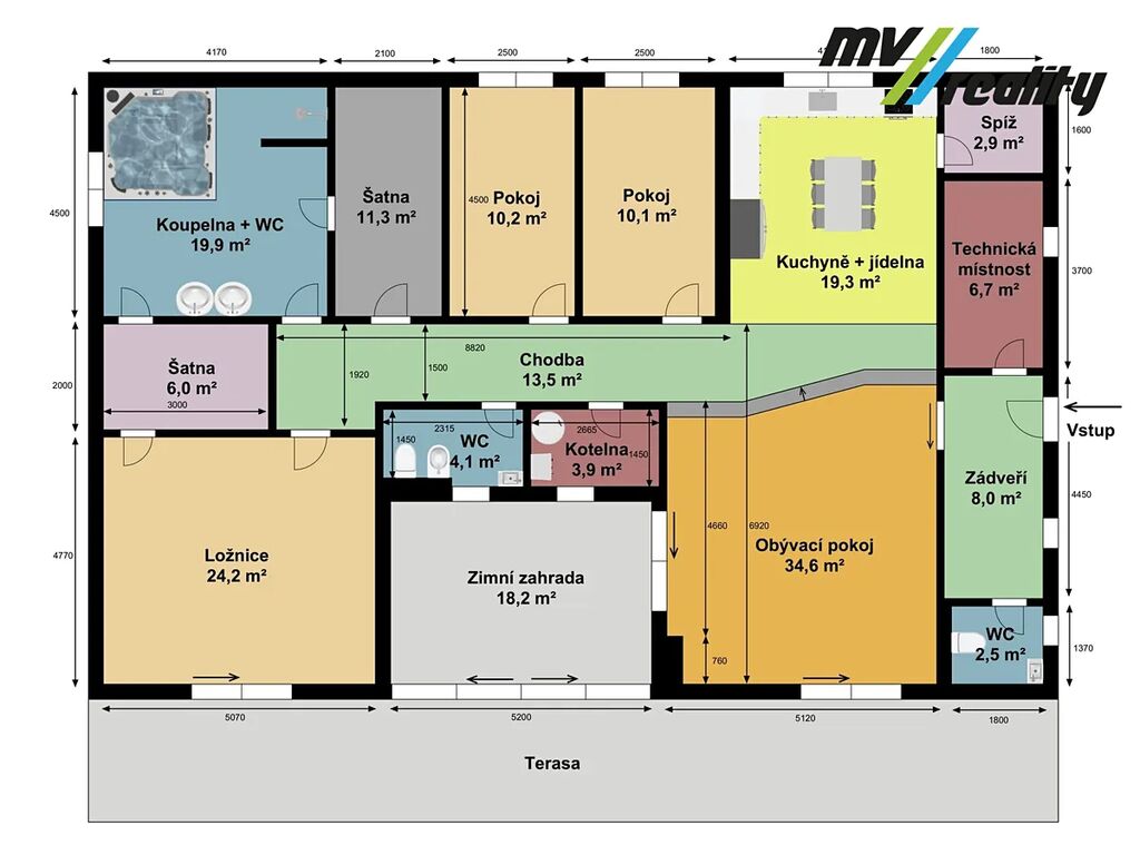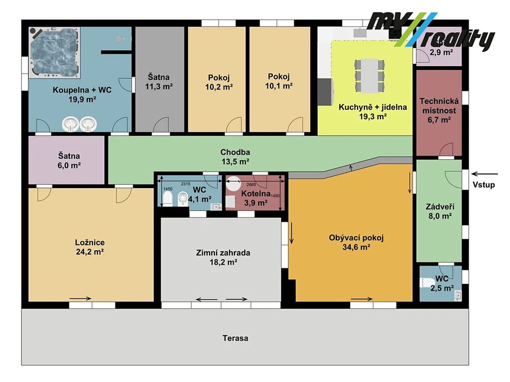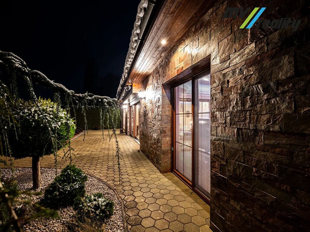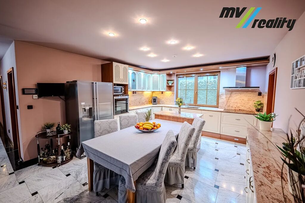 Vstupní chodbou se dostaneme na toaletu, do prádelny a zároveň projdeme do prostorného obývacího pokoje a jídelny s kuchyní. Vedle obývacího pokoje je zimní zahrada, kterou v létě lze otevřít a je z toho příjemné posezení u bazénu. Jídelnou projdeme do klidové zóny, kde jsou 2 pokoje, technická místnost, toaleta, ložnice, 2 šatny a opravdu velká koupelna, kde nalezneme sprchový kout a moderní vířivku pro 6 osob.