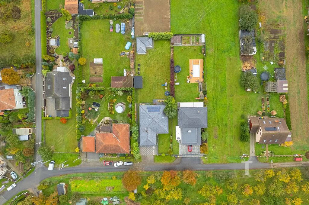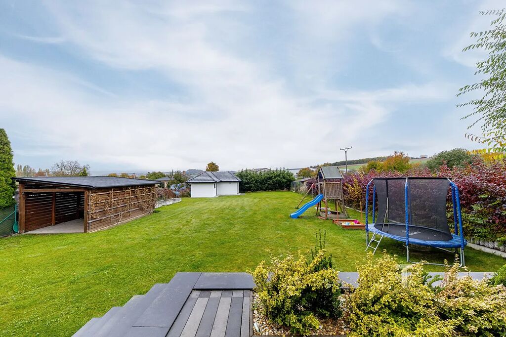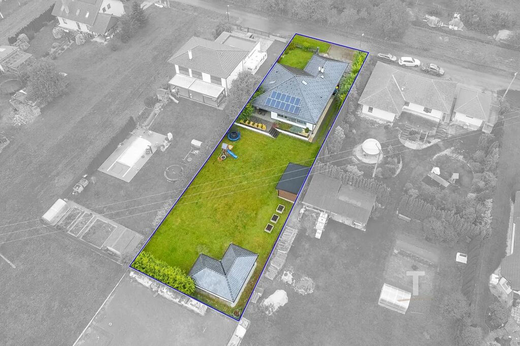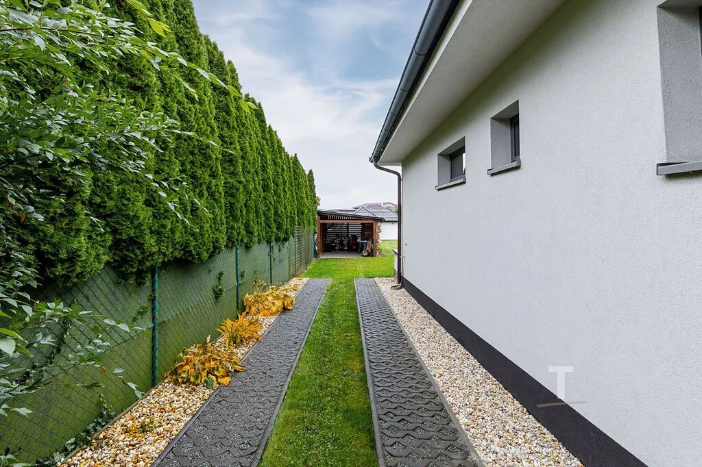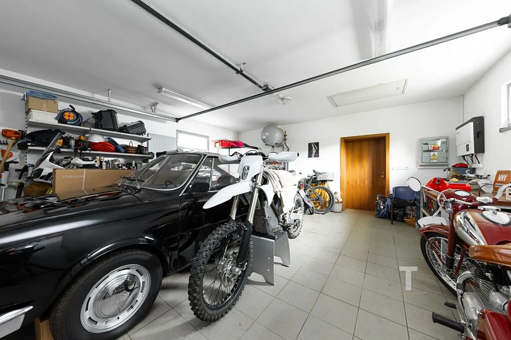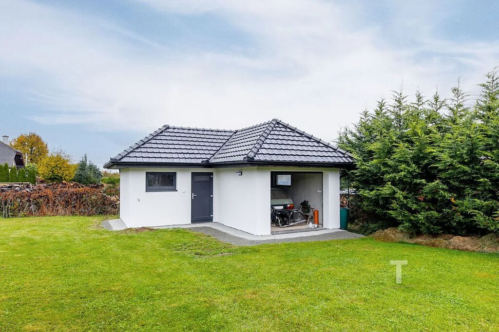 Velkou výhodou je možný přístup na zahradu podél domu (i pro velké nákladní auto), možnost parkování dalších 3 aut před domem na zpevněné ploše. Na zahradě se navíc nachází přístřešek pro další auto či cokoliv jiného. V zadní části zahrady stojí zděný zahradní domek o rozloze 28 m², do kterého je přivedena voda, odpad a elektřina. Uvnitř domku se nachází další garáž a příprava na kuchyni, což znamená, že celý tento prostor může sloužit jako „párty domeček“, malé wellness, posilovna nebo třeba jako dílna pro podnikání.