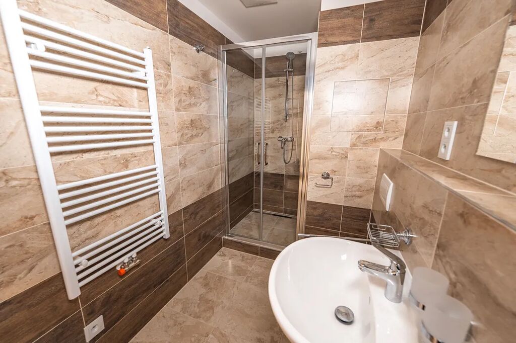 Dosud nebydlený byt je zařízený novou kuchyňskou linkou se elektrickou varnou deskou, troubou, lednicí a myčkou, v koupelně sprchový kout s WC. V předsíni vestavěná šatní skříň.
