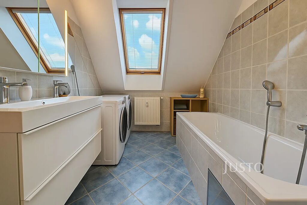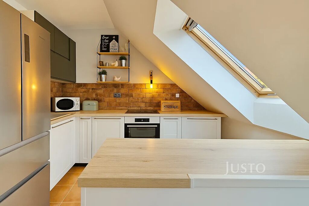 Byt je částečně vybavený a jeho interiér je udržovaný v moderním standardu. Podkrovní část nabízí vzdušné a prosvětlené pokoje s eurookny, které propouštějí dostatek denního světla. Prostor je řešen velmi prakticky, s dostatkem úložných míst (šatna, prostor pod schody, prostor na chodbě v mezonetu) a promyšleným rozmístěním nábytku. Pokoje jsou ideální pro dětské hry, studium i klidný odpočinek. V koupelně naleznete vanu, toaletu, moderní umyvadlo a také místo pro pračku se sušičkou. Kuchyň je vybavena kuchyňskou linkou na míru.
