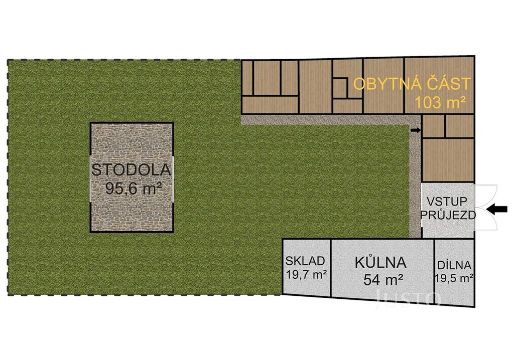 kamenná stodola: 122 m² – vhodná na skladování, nebo s velkým potenciálem pro přebudování na bydlení či jiné využití
