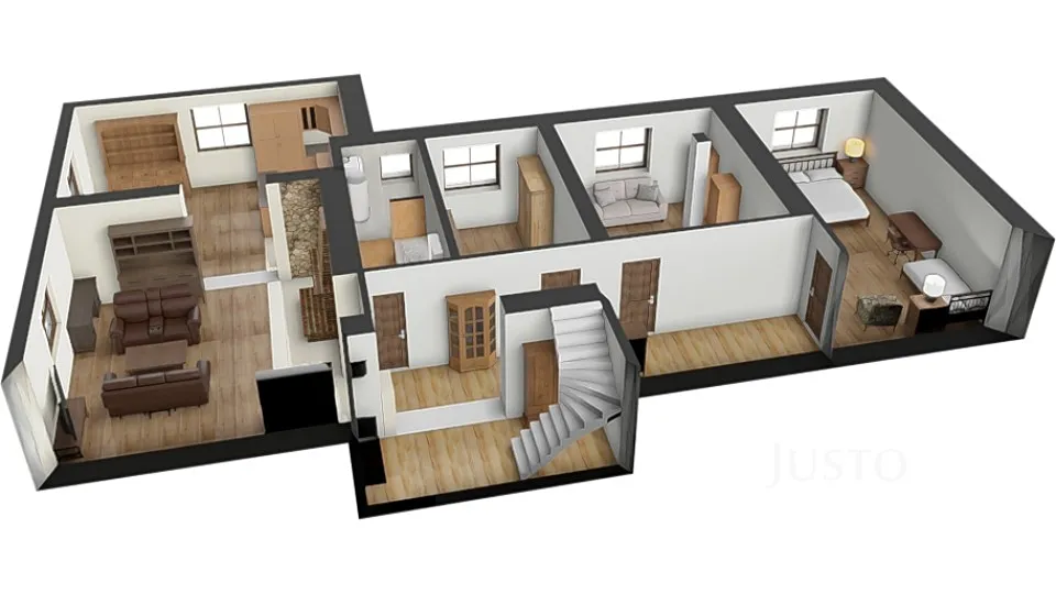 Tento prostorný vícegenerační dům prošel rozsáhlou a citlivou rekonstrukcí a je aktuálně rozdělen na dvě samostatná křídla, čímž nabízí možnost komfortního bydlení pro více rodin, kombinaci vlastního bydlení s pronájmem, případně i komerční využití.
