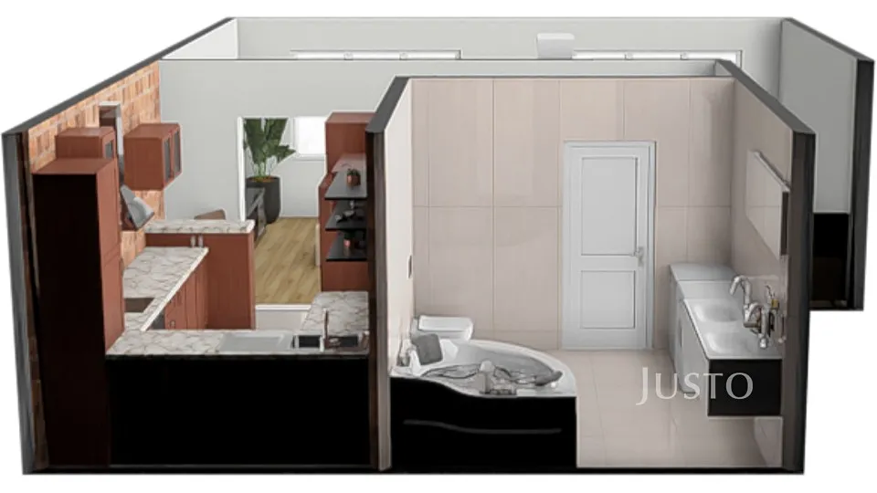 Při vstupu do bytu je předsíň, ze které je vstup do velké koupelny se dvěma okny, ve které je masážní, rohová vana, dvě umyvadla, toaleta a bidet. V čele bytu je kuchyně s prostornou kuchyňskou linkou vč. spotřebičů a např. i drtičem odpadu ve dřezu. Ze dvou obytných místností je nyní jedna, která je předělena šatní skříní.