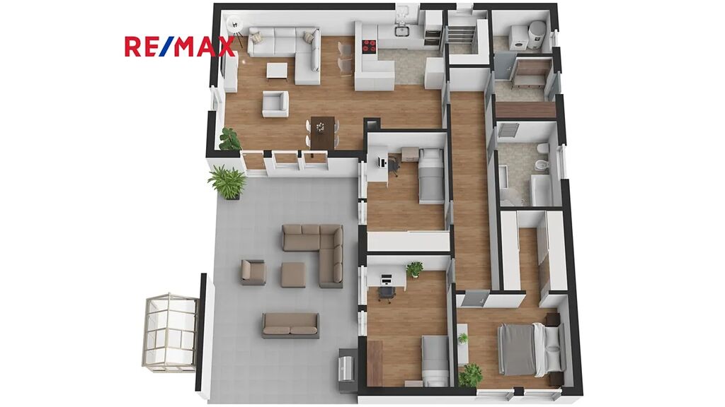 Dům se skládá z prostorného obývacího pokoje s kuchyní a nabízí přímý výstup na zastřešenou terasu, ideální pro relaxaci nebo letní grilování. Ložnice disponuje šatnou a dva další samostatné pokoje mají rovněž přímý přístup na terasu, což zajišťuje dostatek přirozeného světla. Praktická předsíň s technickou místností je propojena s chodbou vedoucí do jednotlivých pokojů. Koupelna je vybavena vanou, sprchovým koutem, toaletou a bidetem.