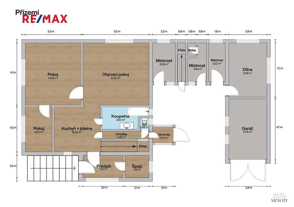 Disponuje 6 obytnými místnostmi, samostatnou kuchyní a zázemím, které nabízí široké možnosti využití. Najdete zde 2 sklepy, 2 půdy, garáž a několik dalších místností vhodných pro dílnu, sklad či Vaše zájmy. Celková zastavěná plocha činí 172 m². Nabízí tak dostatek prostoru pro vícegenerační bydlení, rodinu s dětmi či kombinaci domova s pracovním zázemím.