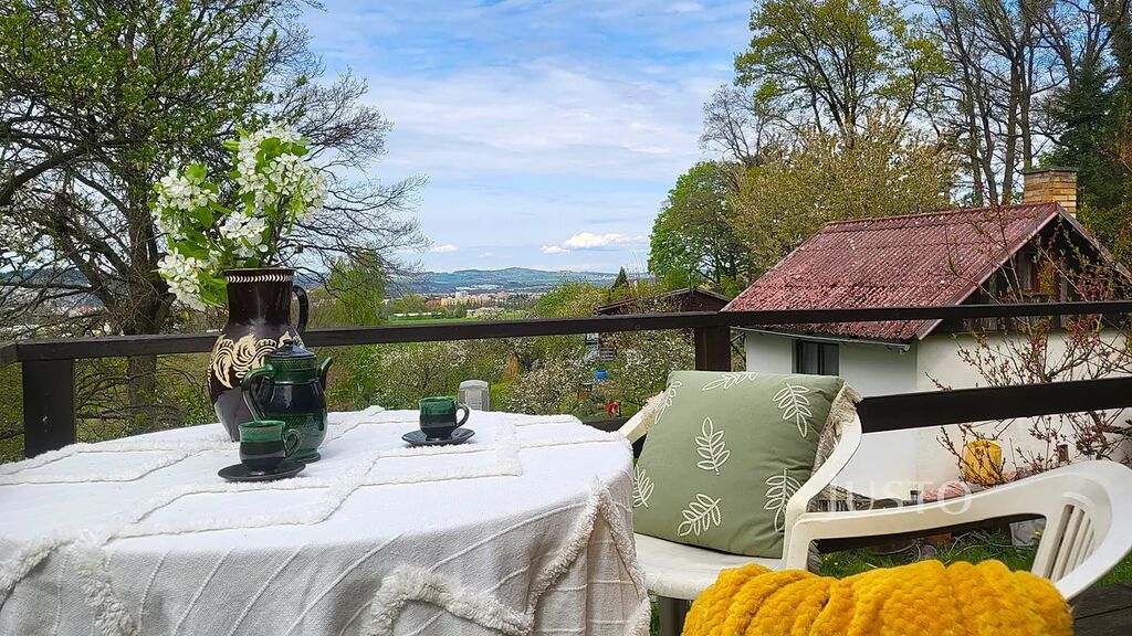 Kolem chaty je terasa s krásným výhledem do krajiny s venkovním posezením.