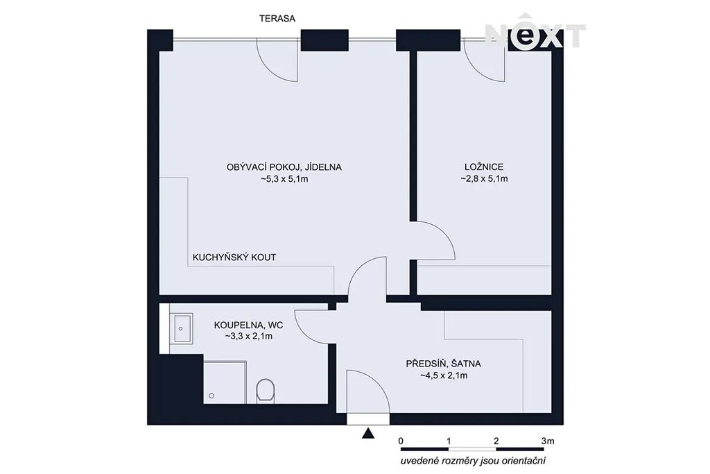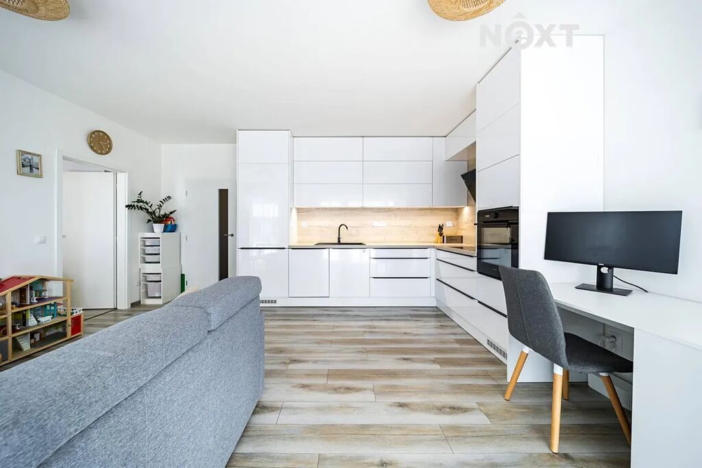 Byt se nachází v moderním domě s výtahem a vyniká promyšleným dispozičním řešením. Dominantou je prostorný obývací pokoj s kuchyňským koutem (28,03 m²), dále samostatná ložnice (14,28 m²), koupelna (7 m²) a vstupní chodba (9,45 m²).