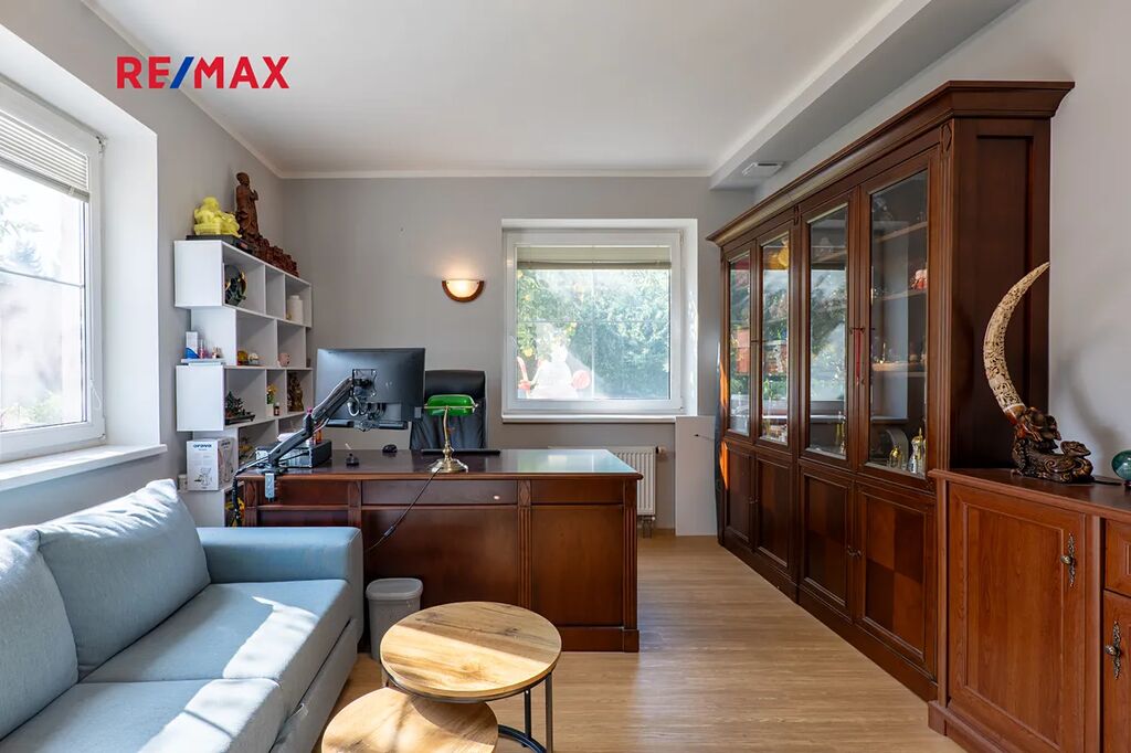 V přízemí se nachází prostorný a světlý obývací pokoj s přímým vstupem do jídelny. Celková plocha místnosti je 24,47 m². Je zde velkorysý jídelní prostor s dostatkem denního světla s přímým vstupem na zahradu. Celková plocha jídelny je 28,55 m². Kuchyňský kout s plně vybavenou a moderními spotřebiči. Celková plocha kuchyně je 11,25 m². Vedle obývacího pokoje je pracovna / pokoj vhodný jako kancelář, dětský pokoj nebo pokoj pro hosty. Plocha této místnosti je 19,83 m².