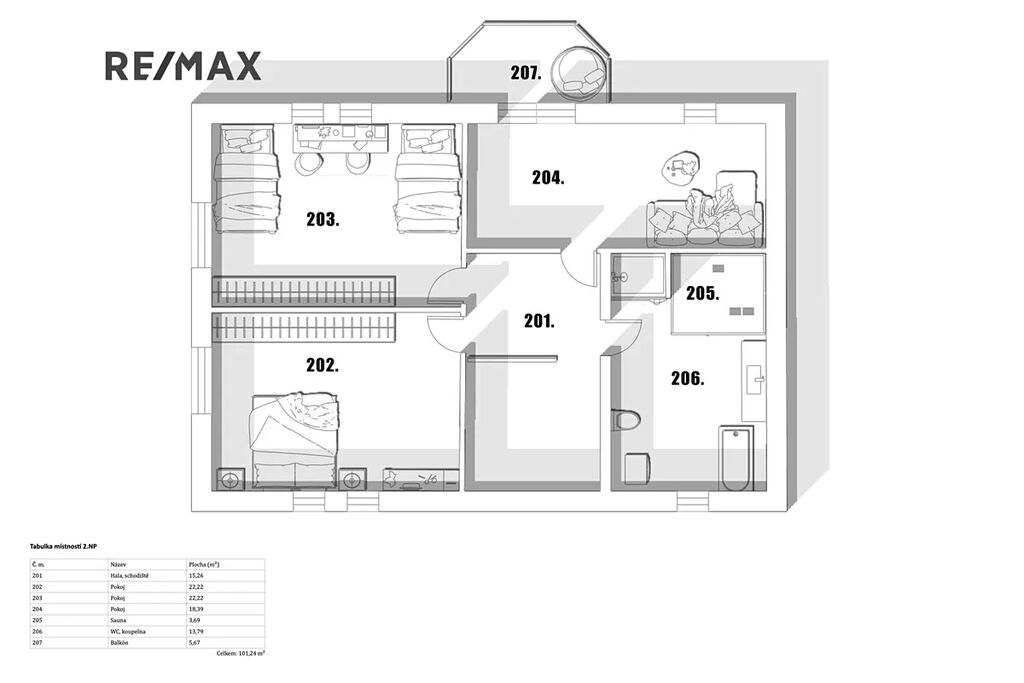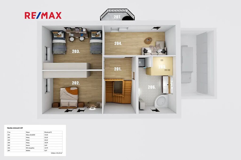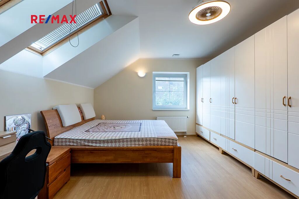 V prvním patře je hlavní ložnice s příjemnou atmosférou a dostatkem úložného prostoru. Plocha tohoto pokoje je 22,22 m². Další jsou zde 2 ložnice s plochou 22,20m² a 18,40m²