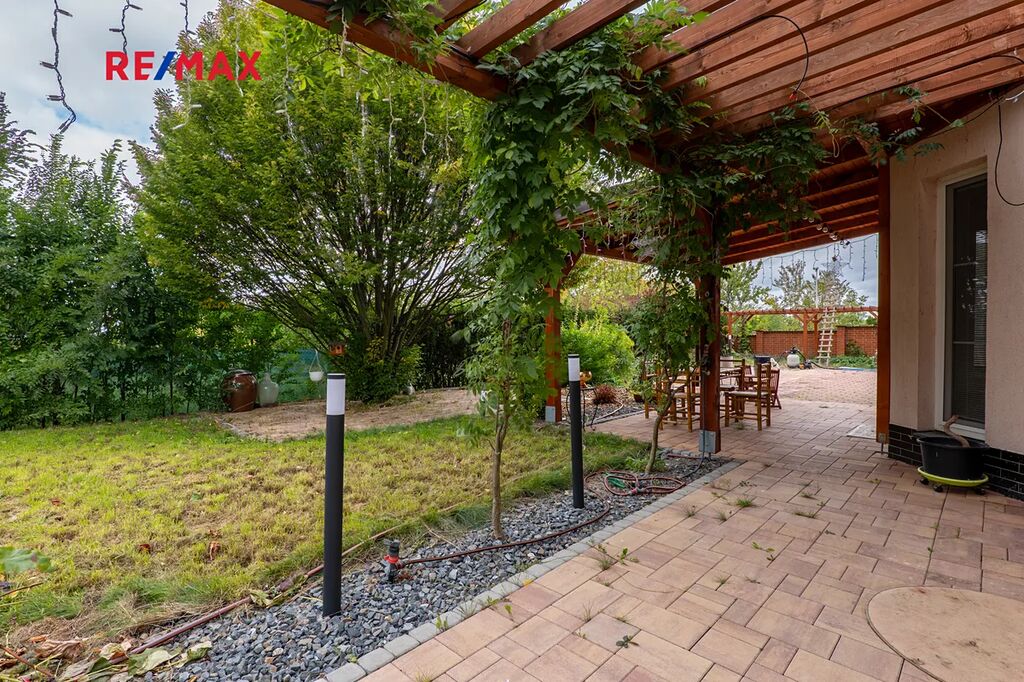 Zahrada s krytou terasou ideální pro rodinné posezení. Součástí je prostor pro bazén a místo pro dětské hry.