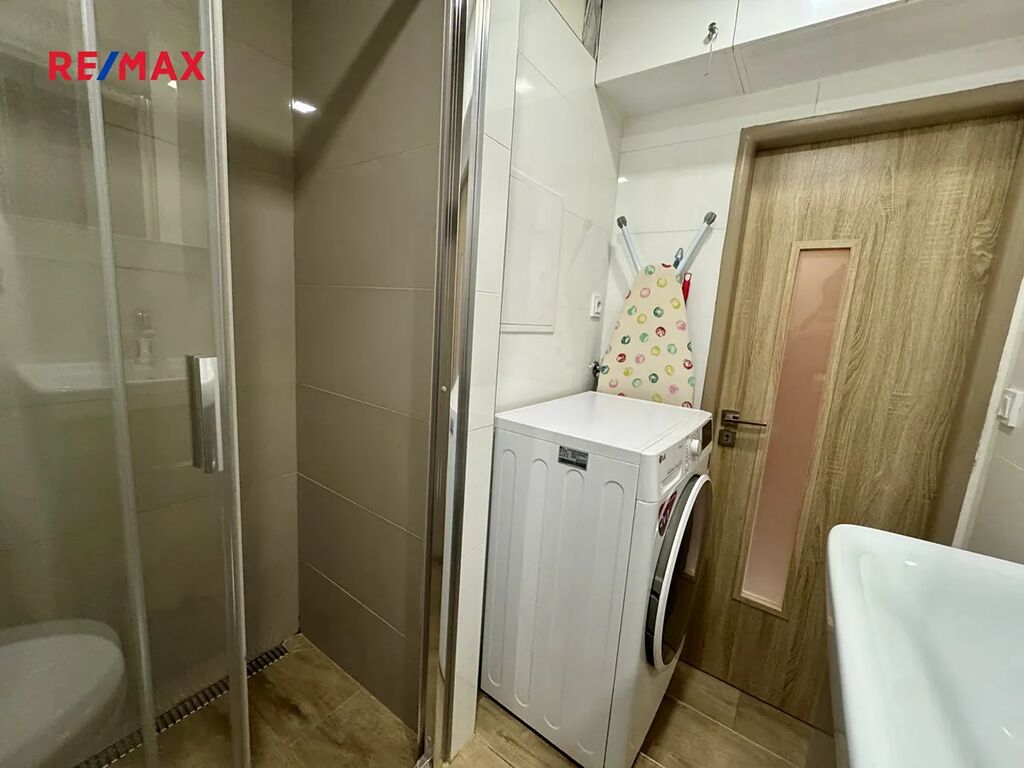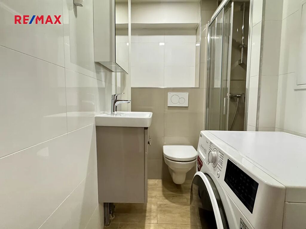 Koupelna je vybavena sprchovým koutem a pračkou. Díky chytrému dispozičnímu řešení a vestavěnému nábytku působí byt velmi vzdušně a útulně.