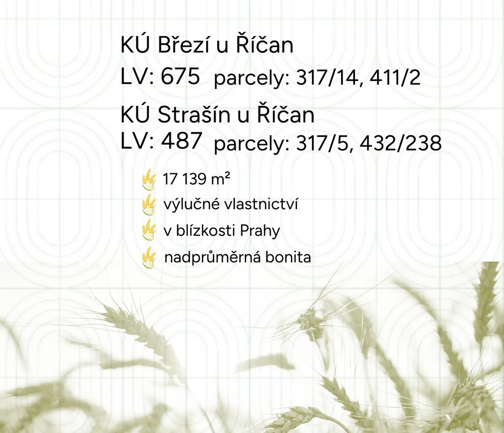 Nabízím k prodeji zemědělské pozemky v okrese Praha-východ, nacházející se ve dvou katastrálních územích: Strašín u Říčan a Březí u Říčan. Pozemky jsou ve 100% vlastnictví.