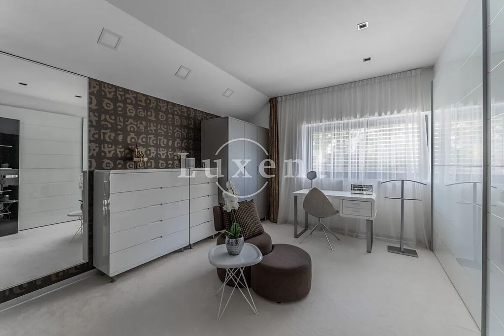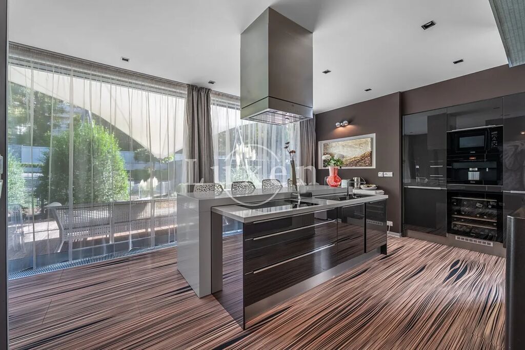 Kuchyně je vybavena špičkovými spotřebiči Miele: parní a horkovzdušnou troubou, indukční varnou deskou, mikrovlnou troubou, vestavěnou lednicí, kávovarem, vinotékou, ale také velmi praktickou ohřívací zásuvkou na jídelní servis.