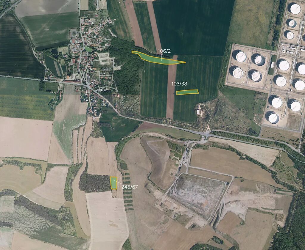 Jedná se o parcely č. 103/38, 106/2 a 245/67 o celkové výměře 25 049 m². Všechny pozemky jsou vedeny jako orná půda a tvoří jeden souvislý celek. Celá výměra je ve 100% vlastnictví a je předmětem prodeje.