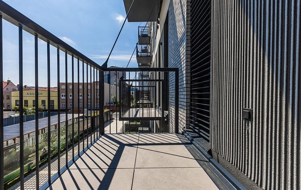 Klidný, slunný byt v nové rezidenci SO-HO v pražských Holešovicích o dispozici 1+kk (49 m2) s balkonem (4 m2) se nachází ve 2. patře průmyslového nízkoenergetického domu Tesla.