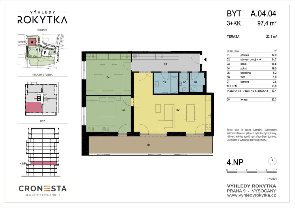 K dlouhodobému pronájmu zde nabízím prostorný byt 3+kk o velikosti 97,4 m² s velkorysou terasou 22,3 m², ke kterému náleží také garážové stání a sklep, obojí již zahrnuto v ceně nájmu. Byt se nachází ve čtvrtém nadzemním podlaží a díky svému umístění poskytuje klidné a světlé bydlení s orientací terasy na jih do zeleně. Sklep je nadstandardně velký, kompletně obezděný, uzamykatelný plnými dveřmi a nabízí vysokou míru zabezpečení.
