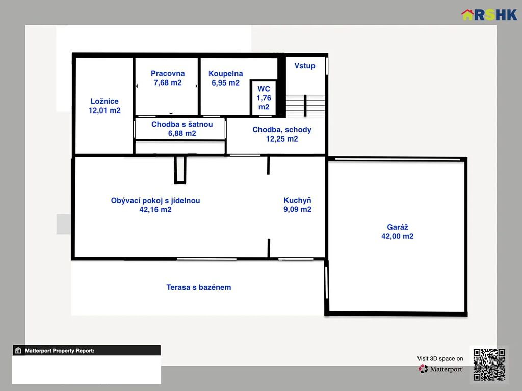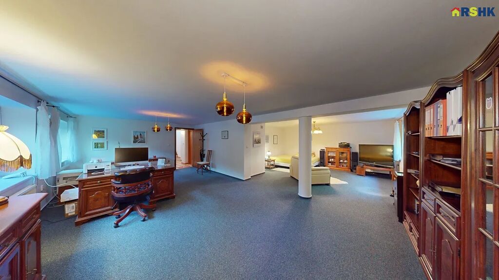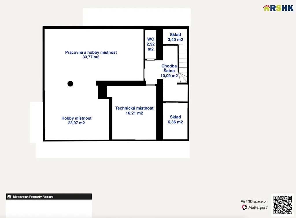 Suterén domu nabízí nečekaně velké zázemí – technickou místnost s plynovým kotlem, pračkou, sušičkou a technologií pro bazén a velkou hobby místnost, která je díky velkým oknům dostatečně prosvětlena. V současné době je tento prostor s výměrou něco málo přes 57 m² využíván jako kancelář pánský koutek. Výška suterénu 2,2 m sice nesplňuje podmínky obytných místností, ale i tak lze tento prostor plnohodnotně využít.