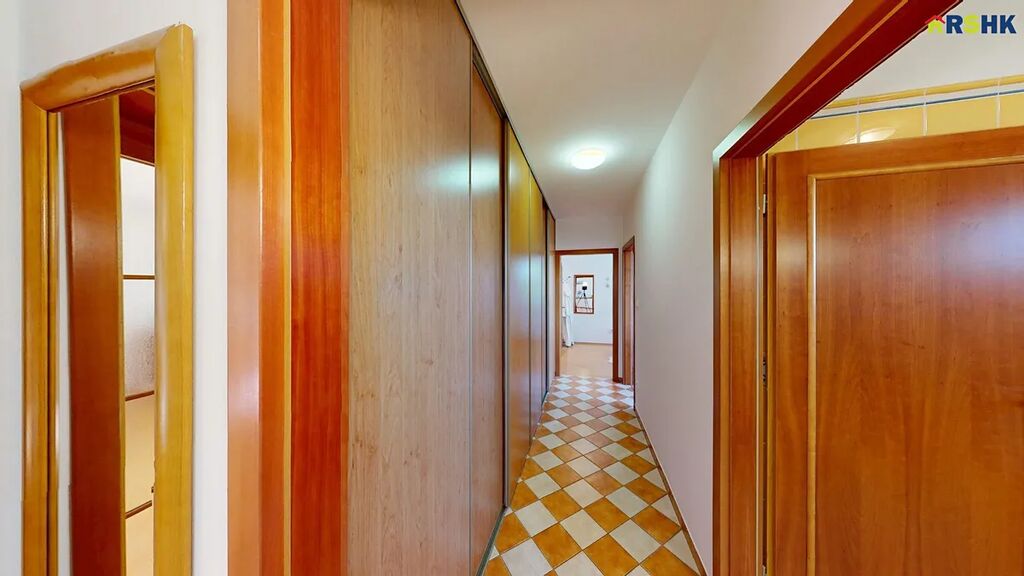 Z chodby vedou dveře do prostorné koupelny s rohovou vanou, sprchovým koutem a dvojitým umyvadlem, samostatného WC, pracovny i ložnice. Přímý vstup na terasu je i z prostorné dvougaráže, což je praktické řešení.