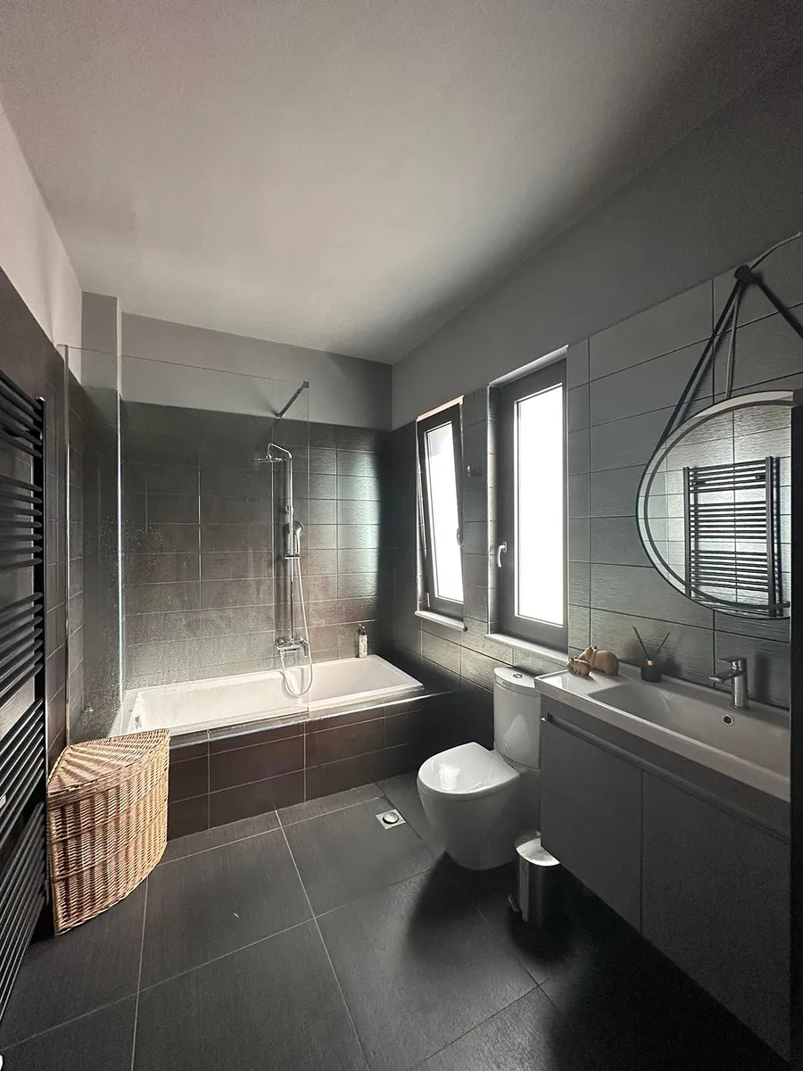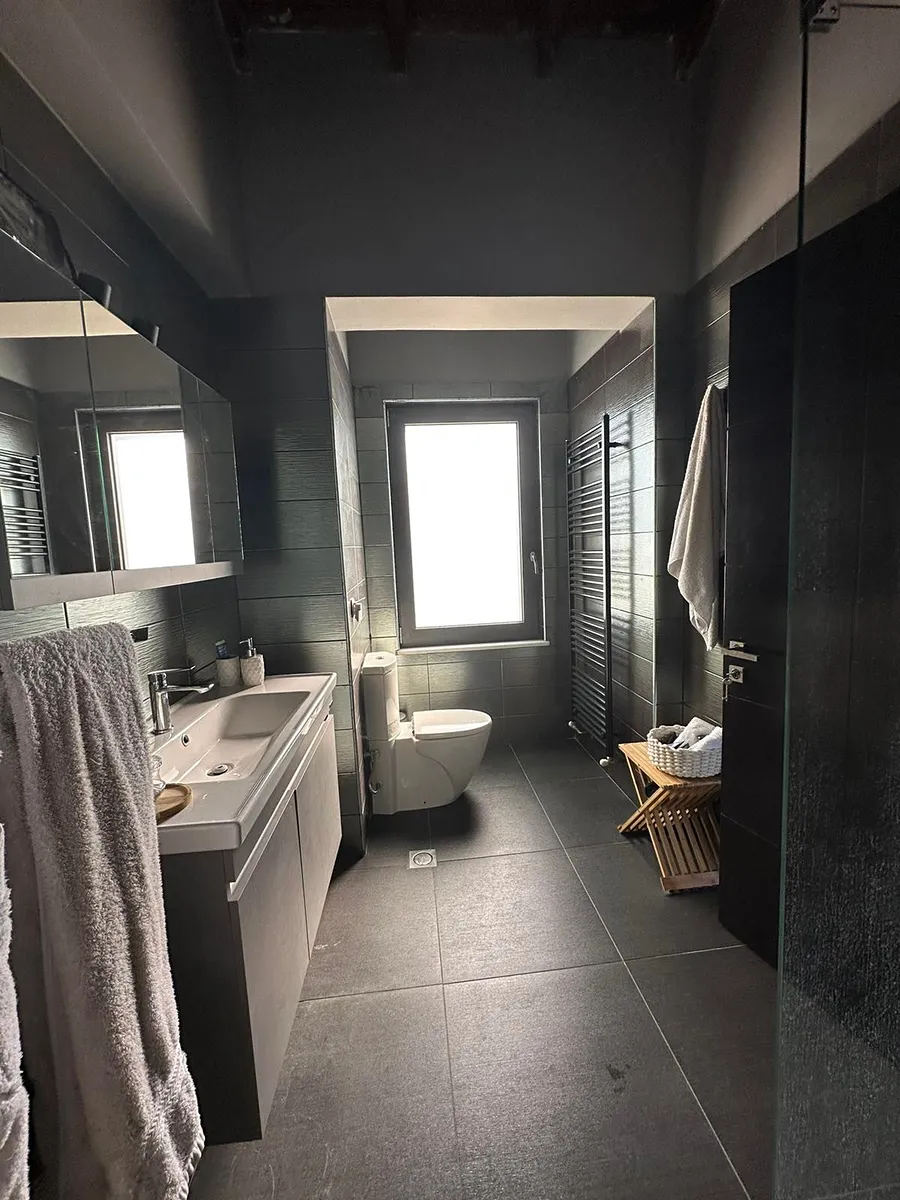 V přízemí je WC a otevřená kuchyň propojená s jídelnou a obývacím pokojem, kde je krb. V patře jsou 3 ložnice s vlastními koupelnami a balkony, ze kterých máte výhled na moře a hory.