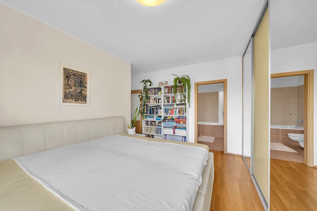 Interiér bytu je navržen v minimalistickém stylu s důrazem na světlo, prostor a funkčnost. Obývací pokoj s kuchyňským koutem je propojen s balkonem, který nabízí příjemné posezení s výhledem do zeleně i na město. Kuchyně je vybavena moderními vestavěnými spotřebiči a výrazným barevným obkladem. Ložnice i další pokoj jsou světlé, s dostatkem úložného prostoru. V bytě se nachází dvě koupelny – jedna s vanou, druhá se sprchovým koutem, což výrazně zvyšuje komfort pro rodinu i návštěvy. V předsíni se nachází vestavěné skříně a zrcadlové dveře, které opticky zvětšují prostor.